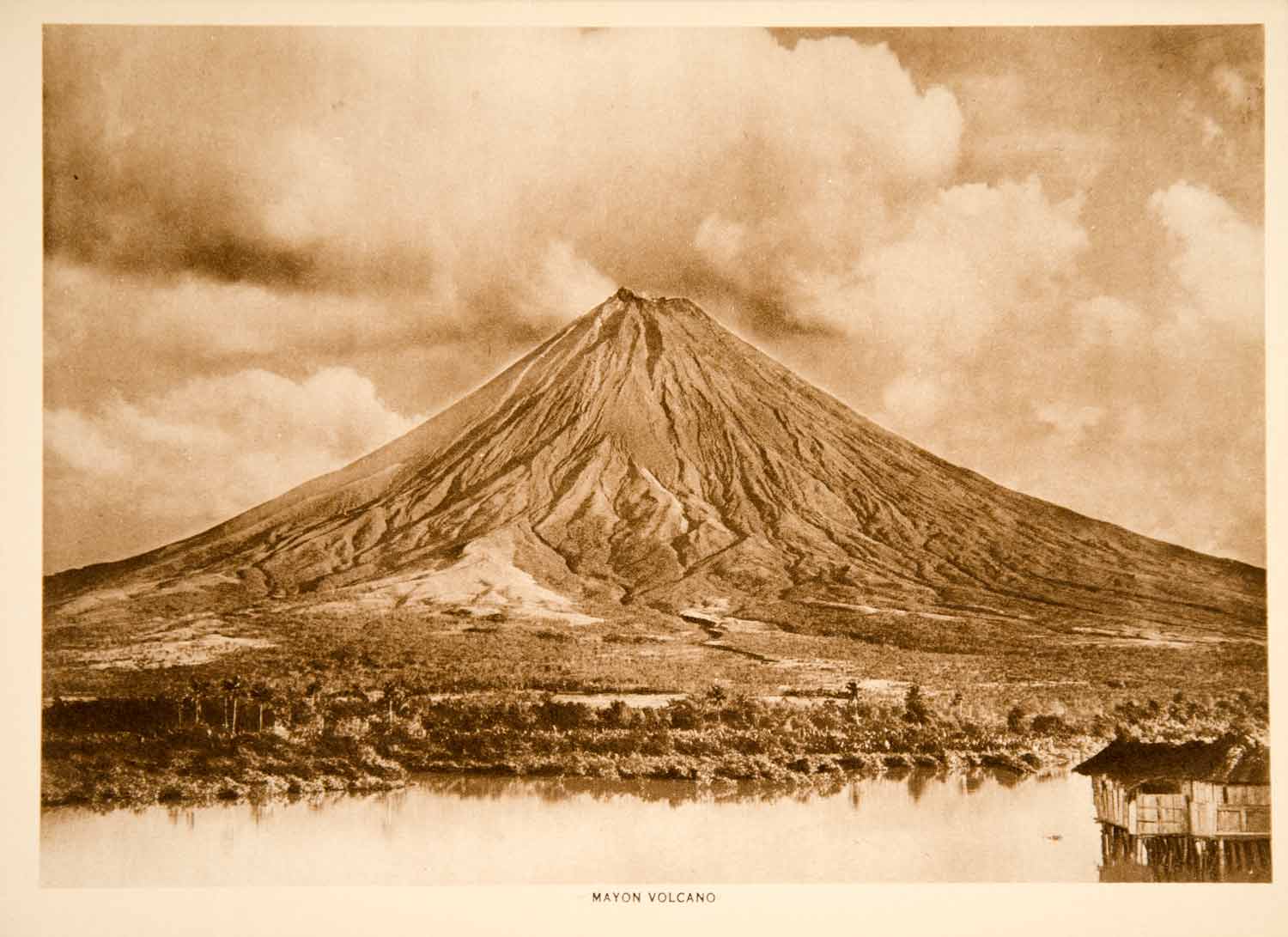 This is an original 1915 black and white photogravure of Mayon Volcano, an active volcano in Albay, on the island of Luzon in the Philippines. Please note that there is a brief descriptive text on the reverse. Please see both images.