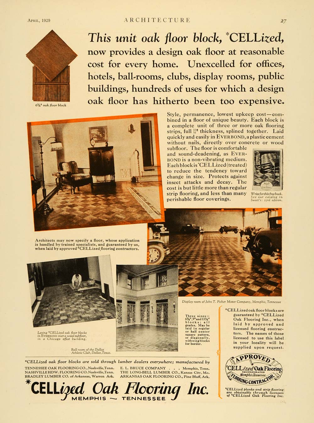 This is an original 1929 color print ad for CELLized oak floor blocks by CELLized Oak Flooring Inc., located in Memphis, Tennessee. This as has pictures of the ballroom in the Dallas Athletic Club, a display room of John T. Fisher Motor Company in Memphis and an office building in Chicago. CELLized oak floor blocks are manufactured by: Tennessee Oak Flooring Company, Nashville; Nashville Hardware Flooring Company, Nasville; Bradley Lumber Company of Arkansas, Warren, Arkansas; E. L. Bruce Company, Memphis; The Long-Bell Lumber Company, Kansas City, Missouri; Arkansas Oak Flooring Company, Pine Bluff, Arkansas.