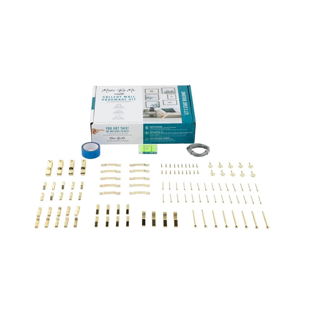 - Gallery Wall Hardware Kit includes: 36 Picture Hangers, 10 Picture Hanger Screw Eyes, 10 Leveling Hangers, 8 Strands of 10FT Braided Wire, 1 Storage Container, 1 Painter’s Tape, and 1 Hanging Guide template